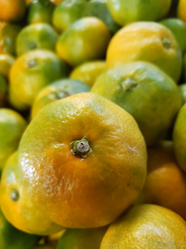 一般的にスーパーで販売されている極早生は黄色くなる処理をしていますので黄色いですが、収穫時には緑色です。それを黄色くしているだけなのです。