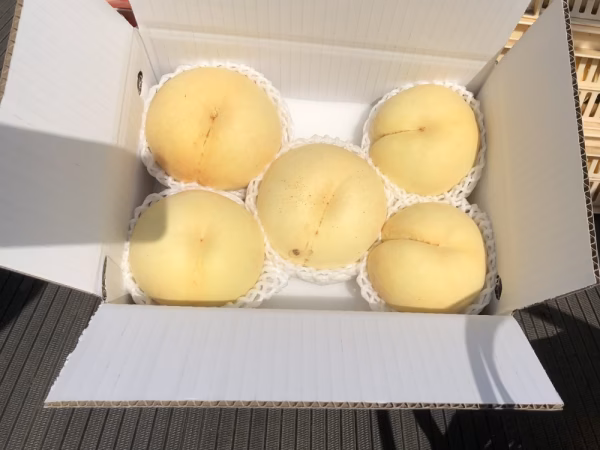 ※JAに出荷する時に一緒に準備します。木で完熟させた桃ではなく、あくまでも市場経由で販売する桃の収穫時期に合わせています。到着時も硬めかと思いますが、店頭では3日程度経過した桃が並ぶ為、いつもより熟度が足りないと感じるかもしれません。その場合はお好みに合わせて追熟して下さい。また桃は日持ちし難い果物ですので追熟の際には十分お気をつけ下さい。