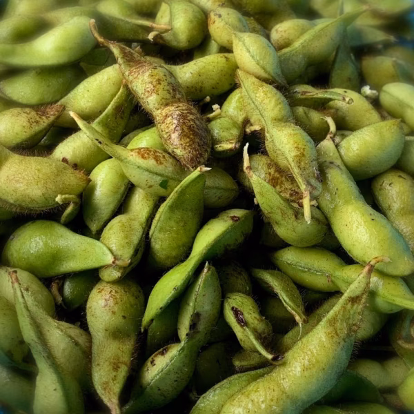 実はさらにぱんぱんになり、うぶ毛さやともに茶色くなり、実は黒くなり始めるものもあります。見た目は少し悪いですが、黒豆になる準備が始まっている表れです。この時期の芋か栗のような香りとホクホクとした食感、甘味は抜群です。湯がいている間にも秋の味覚の香りが漂い、柔らかめに湯がいた黒枝豆は香りと甘さと塩加減がたまらず、手が止まらないおいしさで、地元では特に好んで食べられています。