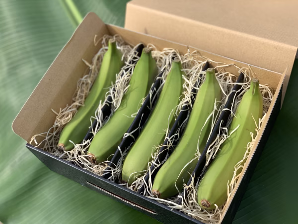 ▼自己紹介 こんにちは!株式会社たかきの高木です。 弊社は熊本県八代市で水稲と露地野菜を生産していますが、2017年から新たな試みとして国産バナナ(三尺バナナ)の栽培を開始しました。 ▼商品概要 ⭐︎「たかきのバナナ」は「栽培期間中農薬・化学肥料不使用」の国産バナナです(くまもとグリーン農業宣言取得済み)! 小さなお子様にもおやつや離乳食として安心して食べてほしいという思いから、手作業で雑草を抜き、愛情を込めて育てました。 ⭐︎一般的な海外産バナナと比べて、酸味が少なく甘味が強く感じられ、香りが強いのが特徴です。皮をむく前から甘く芳醇な香りをお楽しみいただけます。 ▼品種・味の特徴・食べ方 [品種:三尺バナナ] ⭐︎酸味が少なく甘味が強く感じられるバナナです。香りが強く、芳醇な香りがお楽しみいただけます。そのまま食べるのはもちろん、バナナシェイクやシャーベット、ケーキにしてもその甘さや香りが強く残るのでおすすめです♡ ⭐︎とても美味しいバナナなのですが、果皮が薄く、足が早い品種なので熟した状態での保存や長距離輸送には耐えられないという欠点があります。 そのため、採りたての緑色の状態のバナナと一緒に「追熟剤」を同封しておりますので、到着後、「お客様自身での追熟をお願いしております」。追熟の方法も同封させていただきますので、バナナの変化を感じてみて下さいね!また、段々と緑色のバナナが黄色に変わっていく姿はお子さんにとても人気です✨自由研究などにも使われています! どうしても自分で追熟させられる自信がないという方は事前にご相談いただければこちらで追熟処理したものを発送するという対応ができる場合がございます。ご理解の程よろしくお願いします。 [保存方法] ⭐︎当バナナは品種の特性上とてもデリケートです。25℃以上で蜜が入り溶けてしまい、15℃以下では黒ずんできてしまいます。夏場は冷房の効いた涼しいお部屋での保存をお願いします。 ▼数量、分量の目安 化粧箱入り5本セット ▼栽培/生産方法、こだわり [栽培のこだわりは有機肥料と摘果処理] 〜有機肥料〜 弊社はサスティナビリティ(持続可能性)の向上を目指しています。人にも環境にも安心・安全な農産物生産のため、一括管理により生協GAPを遵守した栽培を実施しています。バナナはとてもサスティナブルな作物です。果実を採った後の樹や葉などの残渣は裁断し、自社生産米の米ヌカや籾殻をベースとしたものに混ぜて堆肥としてバナナ園で再利用しています。これにより、バナナ本来の甘さを引き出し、酸味が少ないバナナとなっています。 〜摘果〜 海外産バナナは1本の樹に200〜300本の果実をならせますが、弊社では贈答用:60〜80本、一般用:100〜120本と海外産に比べ半分以上を摘果しています。これにより、樹からよりたくさんの栄養が果実まで行き渡り、濃厚な味わいが生まれています。 また、バナナという作物はその特性上、樹上で黄色くなるまで完熟させることはできません(腐敗や未熟が入り混じる)。そのため、海外産バナナは未熟のまま収穫されています。一方弊社では、ギリギリまで樹上で完熟させることにより(色は緑色ですが、果実の角がとれパンっと張っているのが完熟の証です。)、バナナ本来の食感を追求しました。