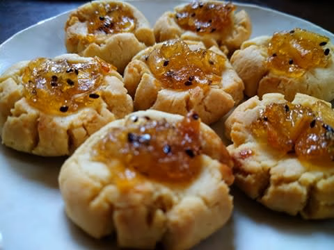 - 名称:米粉のジャムクッキー 原材料名:米粉、大豆粉(遺伝子組み換えでない)アーモンドプードル、パッションフルーツジャム、こめ油、きび砂糖、シナモンパウダー、天日塩 内容量:セット1袋 製造者:ひえばた園 富山県魚津市稗畠1681 1個あたり:カロリー72kcal,タンパク質5.0g、脂質5.0g、炭水化物6.1g、塩分0.1mg アレルゲン27品目対象:大豆○ 加工施設では特定原材料中、小麦、ごまを含む製品を生産しています。
