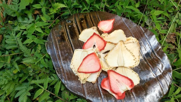 大玉で香り豊かな白い苺を手作業で丁寧にスライス、低温でゆっくり乾燥させました。味も香りもギュギュっと凝縮された苺を味わってください。