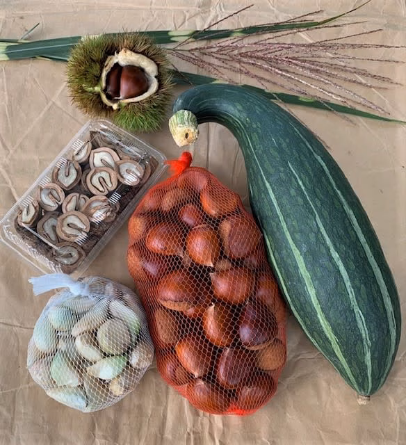 今回はあまり見かけることが無い「ながちゃんカボチャ」と秋の味覚をご紹介いたします。