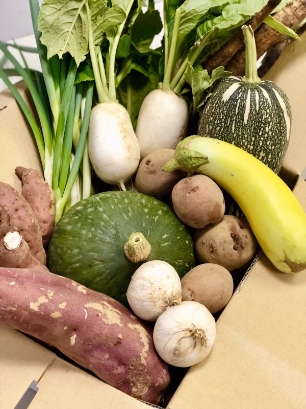 サツマイモ、ナス(緑または黒)、ジャガイモ、ミニダイコン、ゴボウ、ネギ、キュウリ、カボチャ、ピーマン