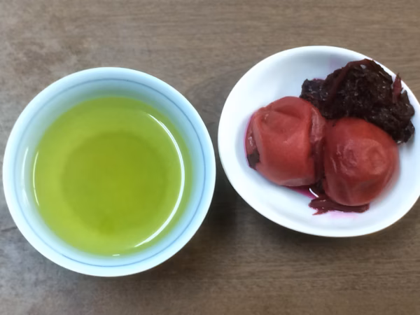 深蒸し茶のお茶請けに昔ながらの梅干し