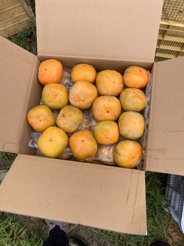 たねなし柿は渋柿で、炭酸ガスを使って渋抜きをした柿です。家庭用で傷ありですが、味は変わりません。