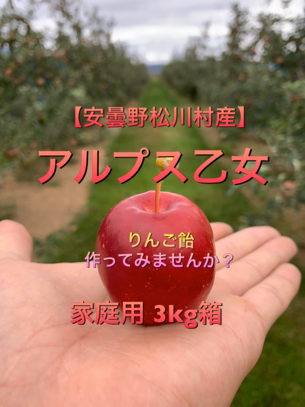 手のひらに乗るかわいいりんご! 安曇野松川村産【アルプス乙女】3kg家庭用  大人になってもこのサイズ! 『ふじ』×『紅玉』から誕生したアルプス乙女 生産量減で希少種になってきました ・酸味と甘味のバランス良し! ・お弁当の彩に! ・長期保管が効く為ご自宅のインテリアに! ・Xmasリースに! ・ご自宅でのりんご飴作りに! 【アルプス乙女】お買い得価格! ※家庭用ですので、小さな傷、若干の色むら等が入りますが、熟期ですので味には影響ありません。 ※80玉前後入ります。 ご覧いただきありがとうございます。 ---------------------------------------- 北アルプスの麓のりんご屋さん やまし平林農園 四代目平林慎也 ---------------------------------------- 【こんなとこ!】 長野県の中央に位置する長野県北安曇郡松川村。標高650m付近にある日本で※数%しかないと言われる希少なりんご産地です。大自然に囲まれ、美味しい水、空気、そして時間がゆったり流れている、そんな小さな村です。 ---------------------------------------- 【アルプス乙女→こんなりんご!】 甘味、酸味のバランスのいい味わい! りんご飴やインテリアにも!! ・酸味○○○ ・甘み○○○○ ・香り○○ ※80玉前後入になります。 ---------------------------------------- 【やましって?】 当園は現在で四代目 初代園主(ひいじいちゃん)の名前が 『志豆男(しずお)』と言い、北アルプスの麓と言うことで『山』に『志』でやまし。 それが当園の屋号となりました。 ---------------------------------------- やまし平林農園 Facebook やまし平林農園 Instagram Shinya Hirabayashi