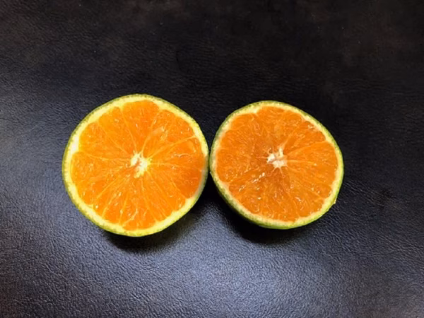 「新品種青のみかん」は、実が果皮よりも早く成熟するため、果皮が黄緑色でも果実は完熟しております。なので、酸味は程よく甘みも感じられます。