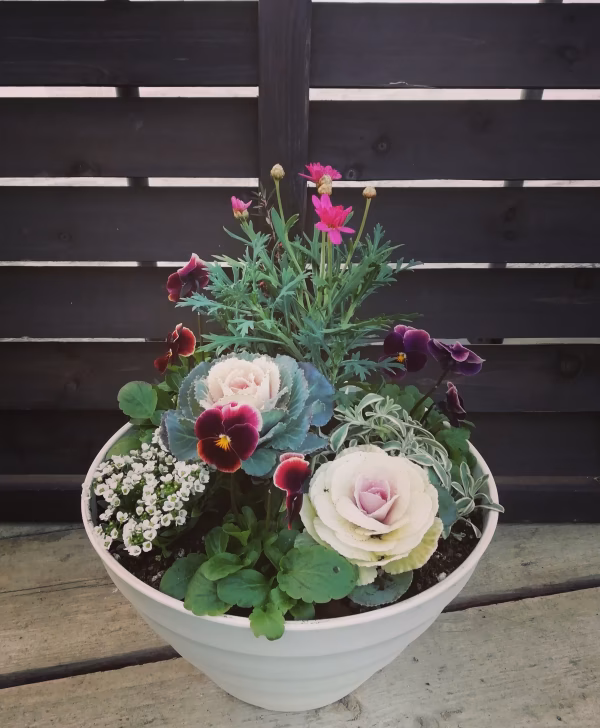 - ★鉢のお花を変更しています。 秋~の宿根八重咲きマーガレット・コニファー・ぎょりゅう梅 その他シレネ・ユニフローラなど ビオラ・アッサム・薔薇のような葉牡丹で作った暖かくなるまでの 寄せ植えとなっています。鉢はホワイト・ブラウンがお選び頂けます。