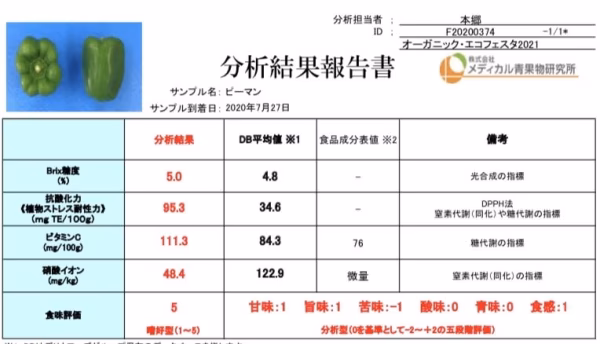 7月末にピーマンの栄養価を分析してもらいました。 結果は、抗酸化力が平均値の2.8倍、ビタミンC含有量が1.3倍と高い値でした。体の中を錆び付かせない野菜になりました。 また、硝酸イオン含量は平均値の4割と少なく、苦味やえぐみの少ない野菜になりました。 今年度のピーマンは、BLOF理論に基づき、土壌分析をして施肥設計をし、ミネラルを適正に散布しました。そのおかげで、ピーマンの花びらは6枚のものが多く、ヘタも六角形のピーマンがたくさんでき、美味しく栄養のあるピーマンになりました。 もちろん農薬は使わず、目標にしていた安心安全な野菜作りが実現できました。 夏に成り疲れがありましたが、ここに来て復活してきました。 ピーク時のような大きなピーマンではないですが、1個50g前後になってます。 1kgあたり20個前後になります。 無限ピーマン、肉詰め、味噌炒め、カレー炒め、青椒肉絲など色んな料理にお使いください。 ビタミンたっぷりなピーマンを是非どうぞ!
