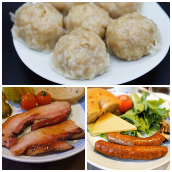 - ベーコン 豚バラ肉、食塩、香辛料、糖類(砂糖)、リン酸塩、発色剤(亜硝酸塩) ソーセージ 豚肉、トマト、豚脂肪、香辛料、食塩、糖類(砂糖)/リン酸塩、発色剤(亜硝酸Na) シュウマイ 豚肉 野菜(玉葱、生姜)、片栗粉、卵、ネギ油、醤油、塩、酒、グラニュー糖、香辛料【皮】小麦粉、食塩/酒精、乳化油脂(一部に小麦、卵、豚肉、大豆を含む)