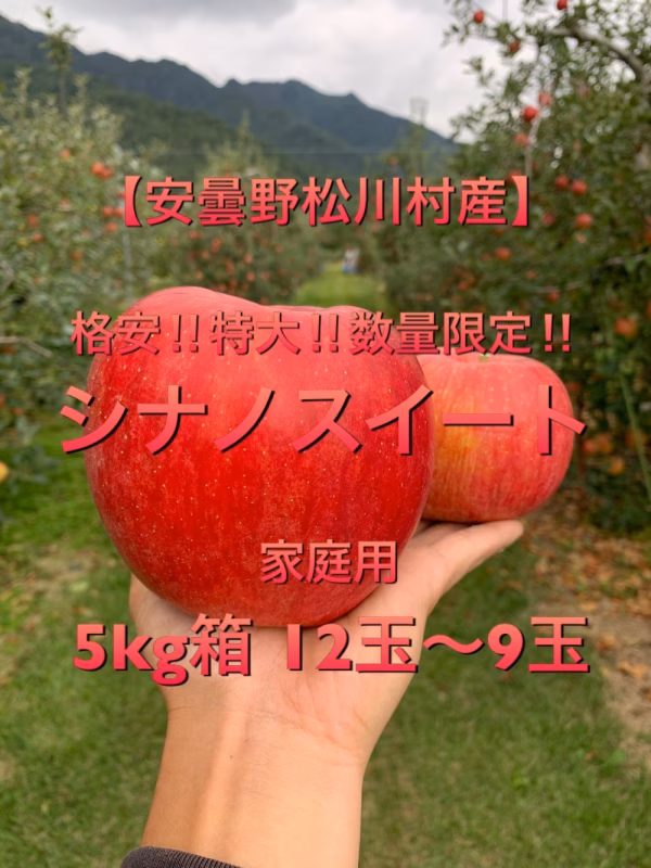 格安!大きすぎて困ってます!数量限定!極甘品種【安曇野松川村産】シナノスイート家庭用 とにかく甘い長野県オリジナル品種 【シナノスイート】!!! 大きすぎて困っている為格安出品です! 希少の為数量限定! ※家庭用ですので、小さな傷、若干の色むら等が入りますが、熟期ですので味には影響ありません。 ご覧いただきありがとうございます。 ---------------------------------------- 北アルプスの麓のりんご屋さん やまし平林農園 四代目平林慎也 ---------------------------------------- 【こんなとこ!】 長野県の中央に位置する長野県北安曇郡松川村。標高650m付近にある日本で※数%しかないと言われる希少なりんご産地です。大自然に囲まれ、美味しい水、空気、そして時間がゆったり流れている、そんな小さな村です。 ---------------------------------------- 【シナノスイート→こんなりんご!】 極甘の品種シナノスイートの登場です ・酸味○ ・甘み○○○○○ ・香り○○○ 酸味がほとんどなくなく、とにかく甘みの強いりんごです。 長野県のオリジナル品種でりんご三兄弟の1人(秋映、シナノスイート、シナノゴールド) ※一段 5kg箱 12玉入〜9玉入になります。 ---------------------------------------- 【やましって?】 当園は現在で四代目 初代園主(ひいじいちゃん)の名前が 『志豆男(しずお)』と言い、北アルプスの麓と言うことで『山』に『志』でやまし。 それが当園の屋号となりました。 ---------------------------------------- やまし平林農園
