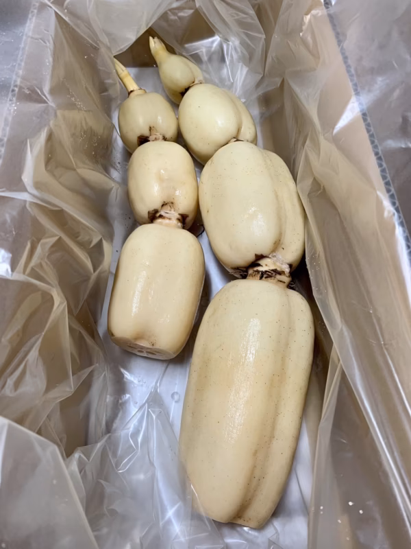 蓮根の部分ごとに食感が変わり、頭の方から柔らかく酢の物やサラダに真ん中は煮物や揚げ物に下の方は水分が少なくでんぷんが多く粘りがあるので、ハンバーグやつみれなどにしていただけると更なる食感が楽しんでいただけます。