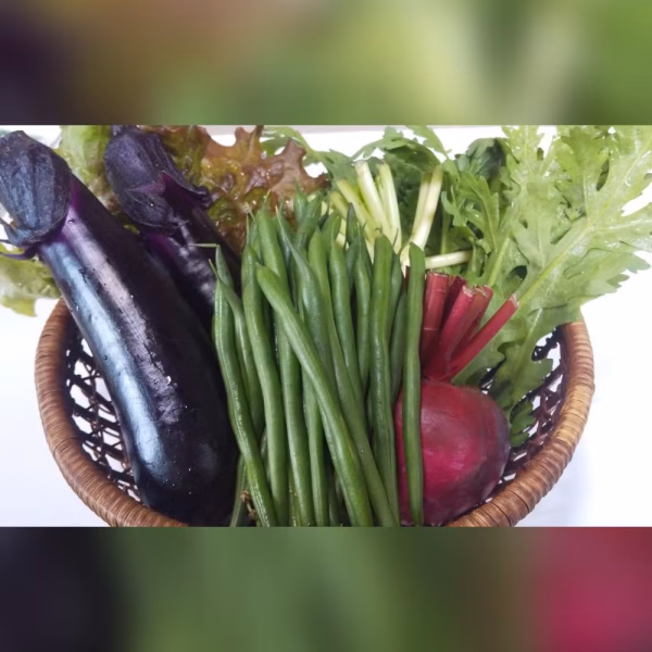 《サニーレタス、サラダ春菊、小松菜、かぶ、ピーマン、ナス、唐辛子、じゃがいも、玉ねぎ…》から、選んでおつけいたします。