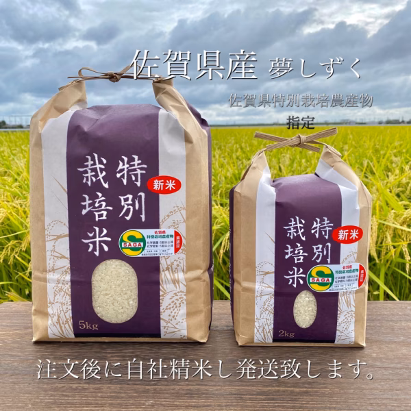 こんにちは! お水が綺麗な小城市三日月町でトマトとお米の栽培をしております松内農園です。 当農園では、お客様の安全を第一に農薬や化学肥料を出来るだけ少なくして栽培しています👨‍🌾🌾  県の現地審査を通して「佐賀県特別栽培農産物」として基準を満たしていると認められたと認証するマークがついています!!一般的な栽培方法と比べ 農薬・化学肥料 を5割以上減らして栽培しています🔆  食味ランキング『特Aランク』夢しずく特別栽培米🍙 夢しずくの特徴は、やはり光沢と粘り気にあります。また、口に含んだ時の食感は少し柔らかめでありながら、噛めば噛むほどに甘みと旨みがでる美味しくて味わい深いお米として知られています! お米を収穫後、知り合いの米農家さんが所有してある乾燥機で乾燥してもらい、松内農園独自の水分量に調整しています。 色彩選別機にかけ、虫に食べられて黒くなったりまだ未熟なお米、白濁してるお米などを取り除いています。 ※5kgとお試しサイズの2kgでの販売ですのでお間違えのないようにお願い致します。