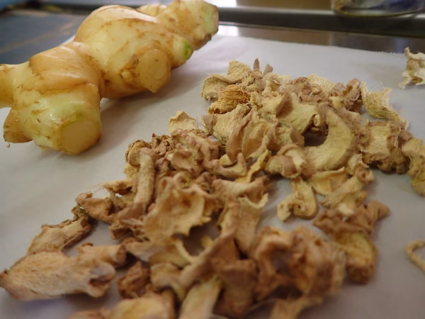 生姜を加熱乾燥すると、生の生姜内にある「ジンゲロール」が変化し、「ショウガオール」や「ジンゲロン」という物質に形をかえます。「ショウガオール」は胃を内側から温め、体の深部まで血行を促進します。「ジンゲロン」にも血行を促進し代謝をよくする働きがあり、脂肪燃焼を促すことからダイエット効果も期待できます。
