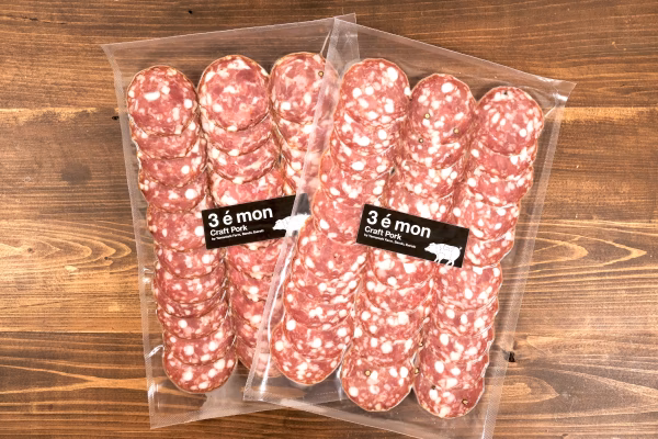 親豚と子豚(通常出荷豚)のモモ肉を半分ずつ使用して製造し、2か月間じっくり熟成した豚100%のサラミです。