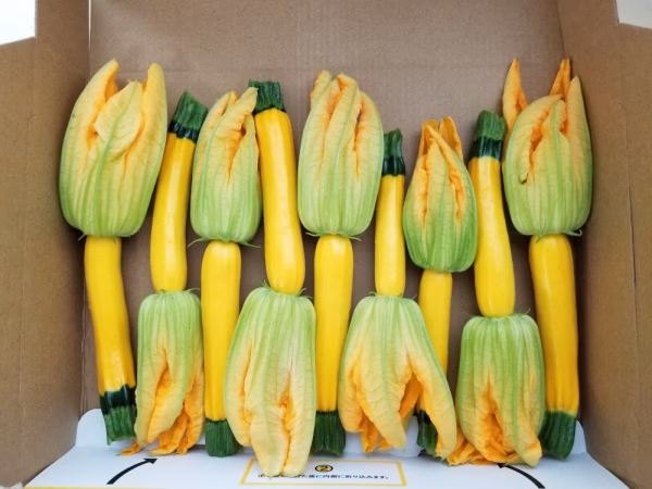 日本三大急流の1つ熊本球磨川源流の水源地水でてきた減農薬花付きイエローズッキーニ。