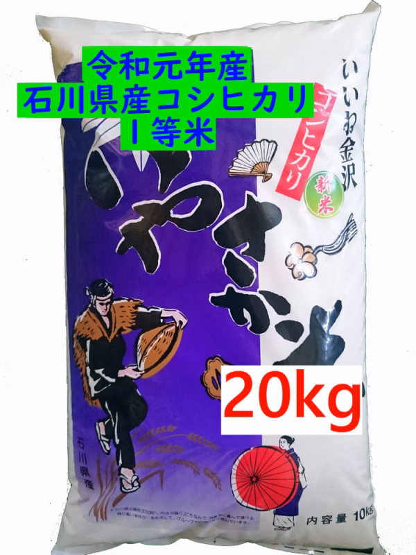 令和1年産 石川県産コシヒカリ 20kg分になります。全量一等米です。玄米または白米、お選びください。