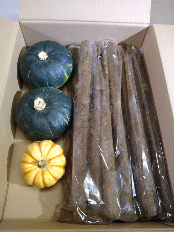 かぼちゃ 大小さまざまなので、3個で1.2㎏以上になるように詰め合わせます。(栗坊 2個、プッチーニ 1個)