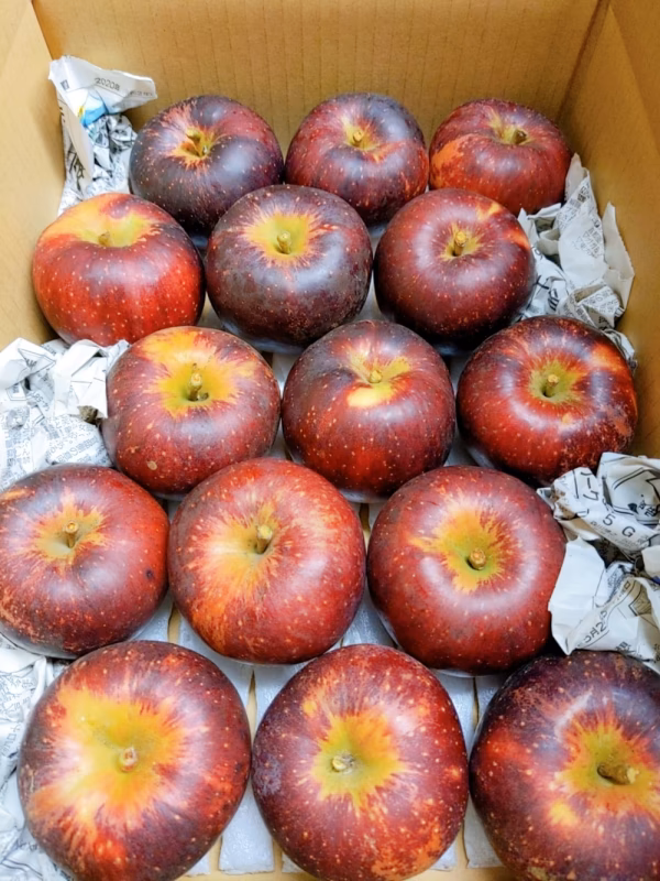 真っ黒に赤黒い見た目が個性的なりんご「秋映」(あきばえ)は信州生まれ、信州の秋を告げる代表的なりんごです。