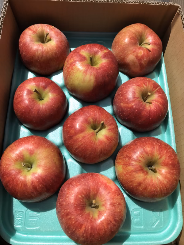 硬めのジョナゴールドを食べれるのは今だけ! 収穫後時間とともに柔らかくなります。 柔らかいのがお好きな方は、購入後しばらく置いてからお召し上がり下さい。 『ゴールデンデリシャス』と『紅玉』の交配種 当農園の果実の大きさは300g〜400g前後で糖度は12-14%程 美しい淡いピンクがかった色の美しい外観をしています。 酸味がありますが、果汁も多く、甘みもありおすすめです。 紅玉ゆずりの肉質なので、サラダをはじめ、料理や菓子等の加工用にもおすすめです。 ●収穫時期と食べごろの旬 地域にもよりますが、当農園では 10月上旬に始まり10月中旬頃まです。 貯蔵性は、常温で2週間程度、低温化であれば 2ヶ月程の貯蔵ができますの。 食べ頃の旬は収穫直後の10月下旬~12月頃。 甘 味:★★★ 酸 味:★★★★ 硬 さ:★★★ 大きさ:★★★ 熟してくると果皮からは、油状のろう質物を分泌するので、 果実表面が光るようになります。 私たちは油があがるといいますが、触るとベタつきます。 収穫後、室内に保存しておいても油上がりは進みます。 ビニールの袋に入れて、冷蔵庫で保存がいいでしょう! りんご栽培は、沢山の手間をかけておいしいりんごをお届けするために、収穫の時期までさまざまな作業を行います。 雪の降る冬にりんごの枝の剪定から始まり、春に花が咲くころには交配、花が咲き揃ってからは摘花、実ができ始めたころには摘果、りんごが色づく秋には葉摘み、玉まわしなどの作業を行います。 しかし、いくら気をつけても防ぎきれないのが自然の影響です。 台風はもちろんですが霜や雹などのほかに、雨によっても影響されます。つる割れは花の咲く時期、霜、雨の降る時期が発生に関与していると考えられています。 すべて、丹精込めて手間暇かけて栽培したりんごです! おいしく召し上がって頂けると幸いです。