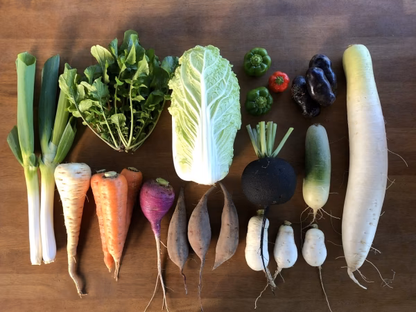 固定種とは、生育の勢いや姿形の揃いが良い交配種(F1)の流通に押されている昔ながらの作物です。手間ひま掛けて実った種をまけば、同じ特徴を持った作物の収穫を続けることができます。人類は作物と共に生き抜いてきました。作物の種子は遥か昔からの贈りものであり、次の世代にも渡すべきバトンに思えます。旬の品目と野菜の魅力を味わってください。