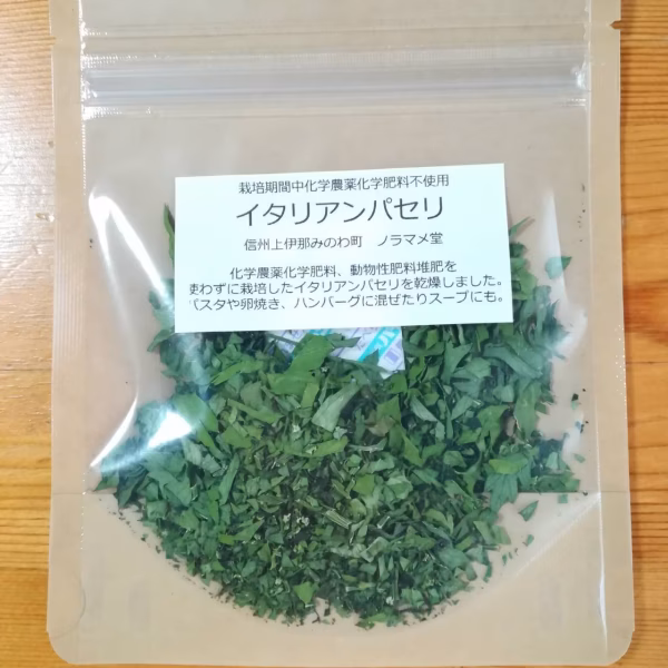 化学農薬、化学肥料、動物性の堆肥、肥料を使わずに栽培したイタリアンパセリを乾燥させました。