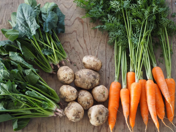 - 届きましたら、箱から出して野菜の無事をご確認下さい。生鮮食品ですので、出来るだけお早めにお召し上がり下さい。 ⭐︎人参、ほうれん草は冷蔵庫の野菜室で保存して下さい ⭐︎じゃがいもは、日の当たらない風通しのよい場所で保管して下さい