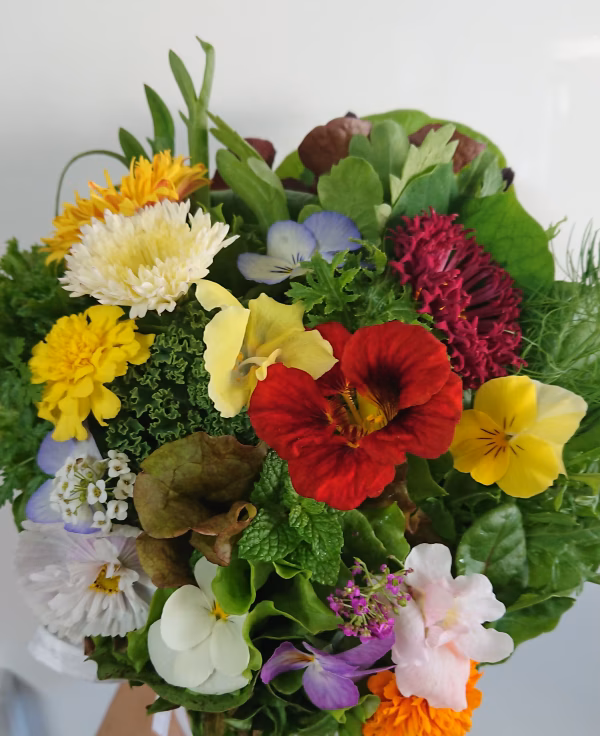 このハーブサラダブーケには、多数のハーブ、野菜、エディブルフラワーが入っており、お皿に広げるだけでレストラン顔負けの素敵な素敵なサラダになります✨