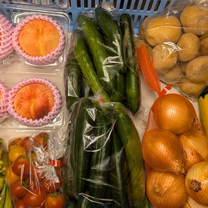 桃、ズッキーニ、カボチャ、ジャガイモ、キュウリ