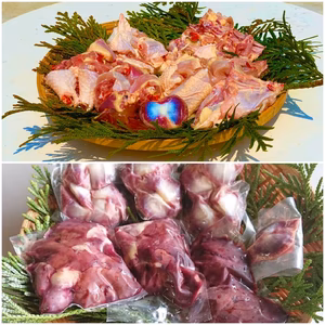 注文受付停止中野田清照注文から4~7日で発送みやざき地頭鶏骨付きぶつ切りと砂ずりハツレバーの1キロセット宮崎県宮崎市ぶつ切りは3パックに分けて真空パック。砂ずりハツレバーは、500gずつ2袋5,560円 +送料1,500円