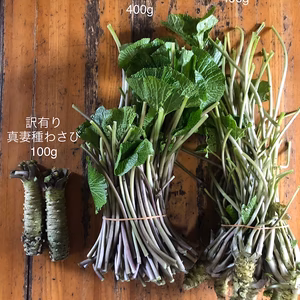 注文受付停止中浅田恵子注文から3~7日で発送【リクエスト商品】キズわさび(真妻種わさび)100gと茎わさび400g+葉付き小静岡県伊豆市1袋100g(2〜3本)と1袋400g×2〜3,805円 〜+送料1,195円