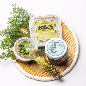 注文受付停止中浅田恵子注文から3~7日で発送【リクエスト商品】茎わさび1束と葉付き小わさび1束+自家製わさび加工品4個静岡県伊豆市葉付き小わさび1束+茎わさび1束+加工2種1個ずつ〜3,240円 〜+送料965円
