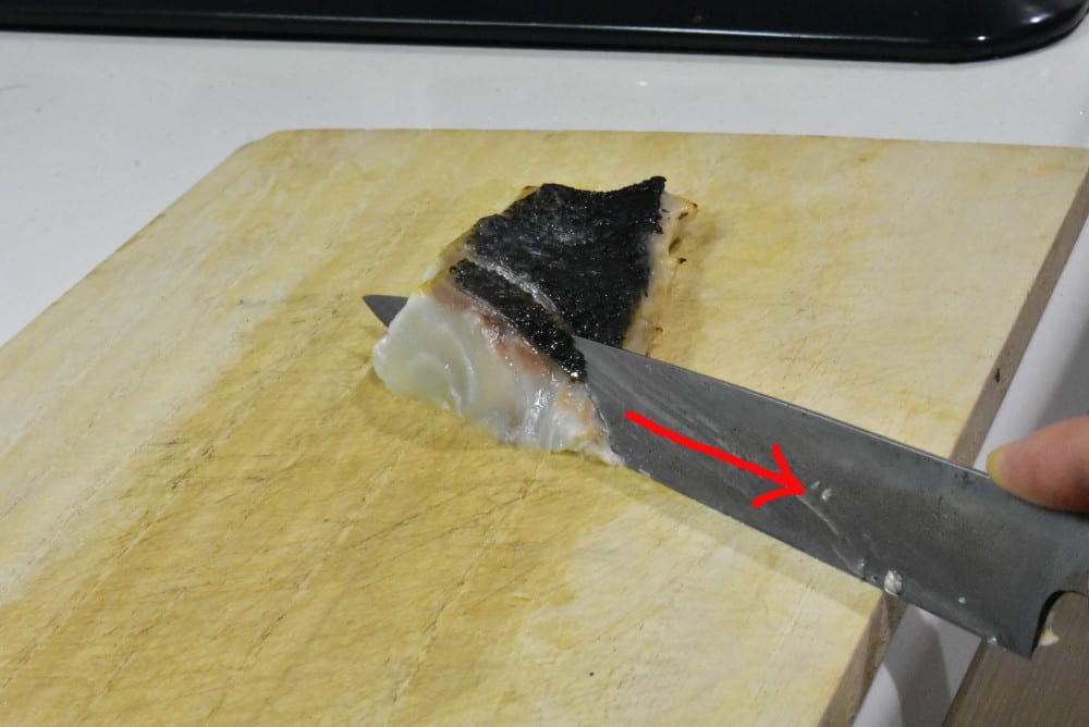 この時、包丁を魚の身に対して垂直に入れるのではなく、少し右側に寝かせるくらいの角度にします。