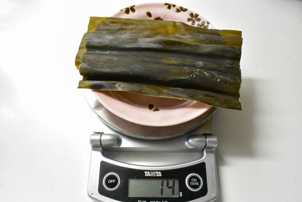 1枚6gであれば、この大きさの昆布が3枚あればおよそ20g分ということ。試しに、計ってみましょう。