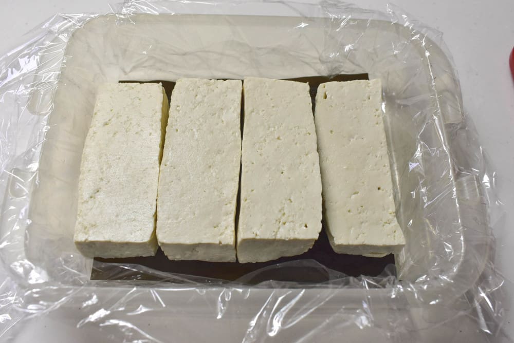 1.もめん豆腐は、キッチンペーパーで包み、上から重しをして3時間ほど水切りをします。