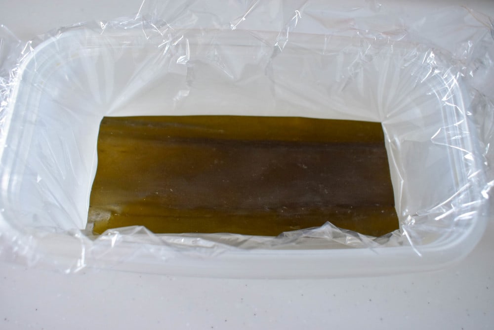 1.タッパーの中にラップを敷いて、その上に昆布を置きます。