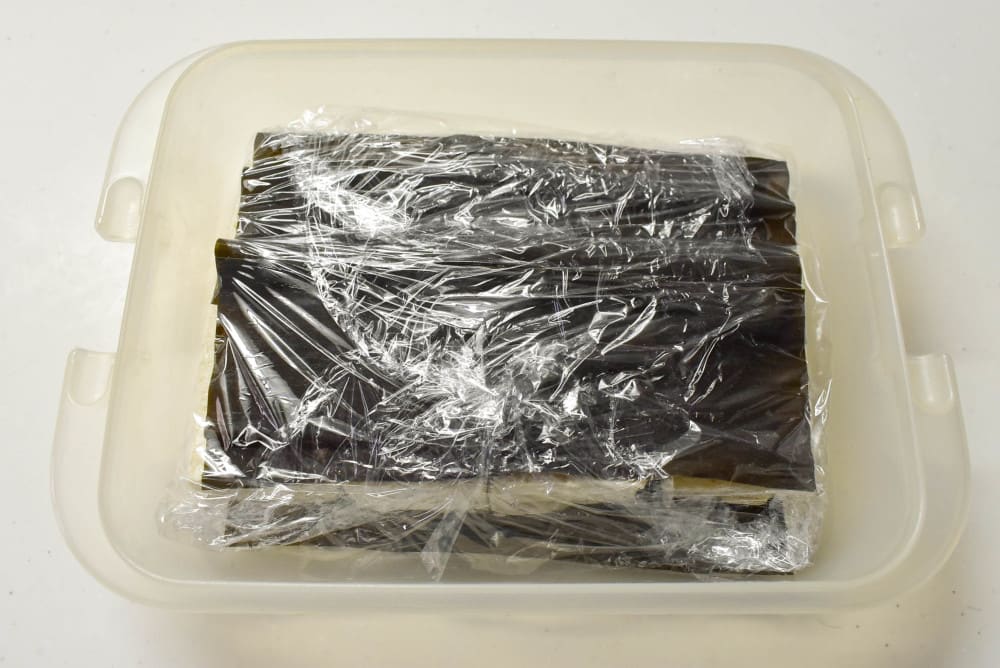 3.昆布でサンドしたらラップでピッチリ包み、1晩置きます。