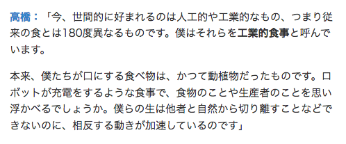 高橋といえば、講演の度に、コンビニ飯や牛丼、ジャンクフードなどをまとめて「工業的食事」と称し、”農”と離れた生活の実例として示していることは、一部の高橋マニアの間では公然の事実です。