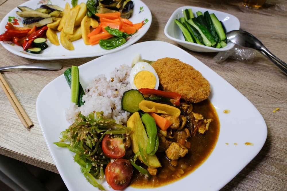 ということでお皿にたっぷりお米とカレーと揚げ野菜をよそいまして……