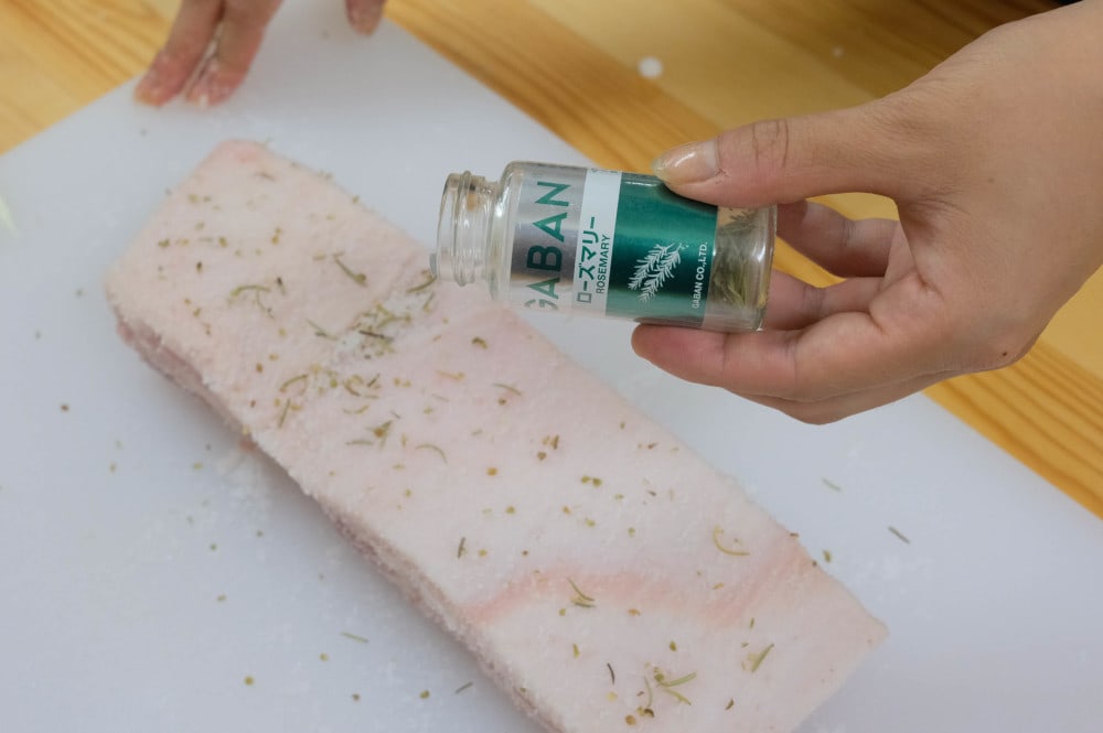 ここからは自由演技です。手持ちのスパイスを好きなだけすり込んでいきましょう。ハーブを育てている方は、ハーブを添えても良いかもしれません。