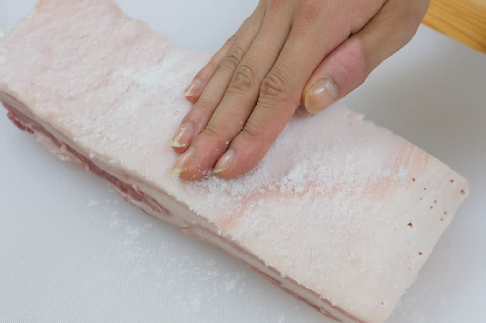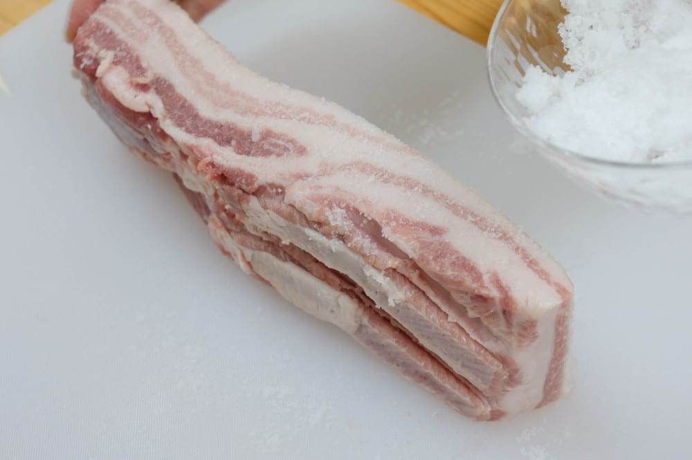 塩漬けの下ごしらえをします。ここがベーコンづくりの最初の難所、「塩の計量」です。
