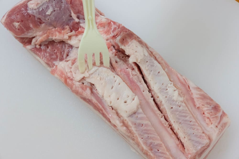 塩をすり込む前に、お肉にフォークでまんべんなく穴を開けます。上下面のみならず側面もバランス良く刺していきましょう。