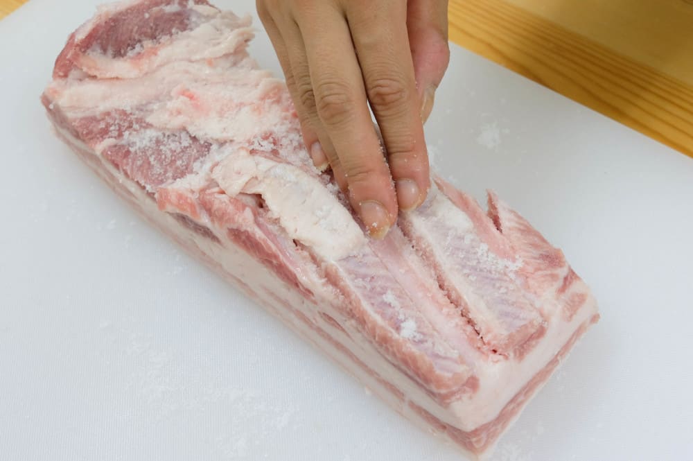 ベーコンづくりの工程はおおまかに、肉を塩漬けする→熟成→塩抜き→乾燥→燻製となっています。