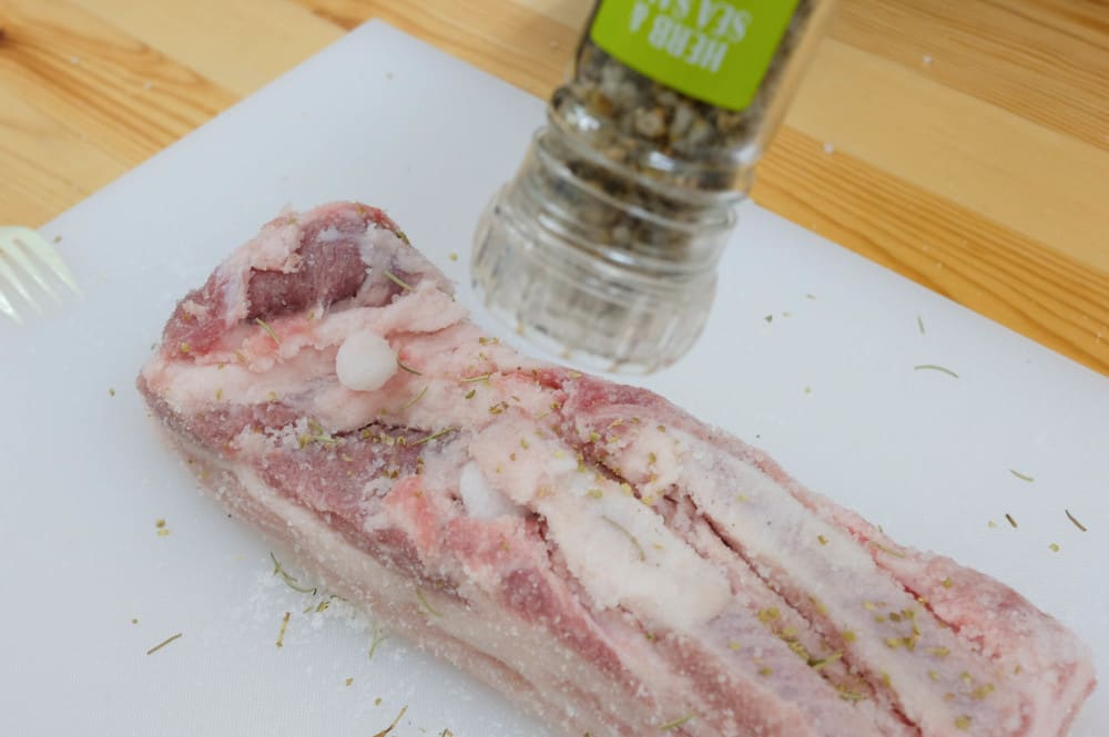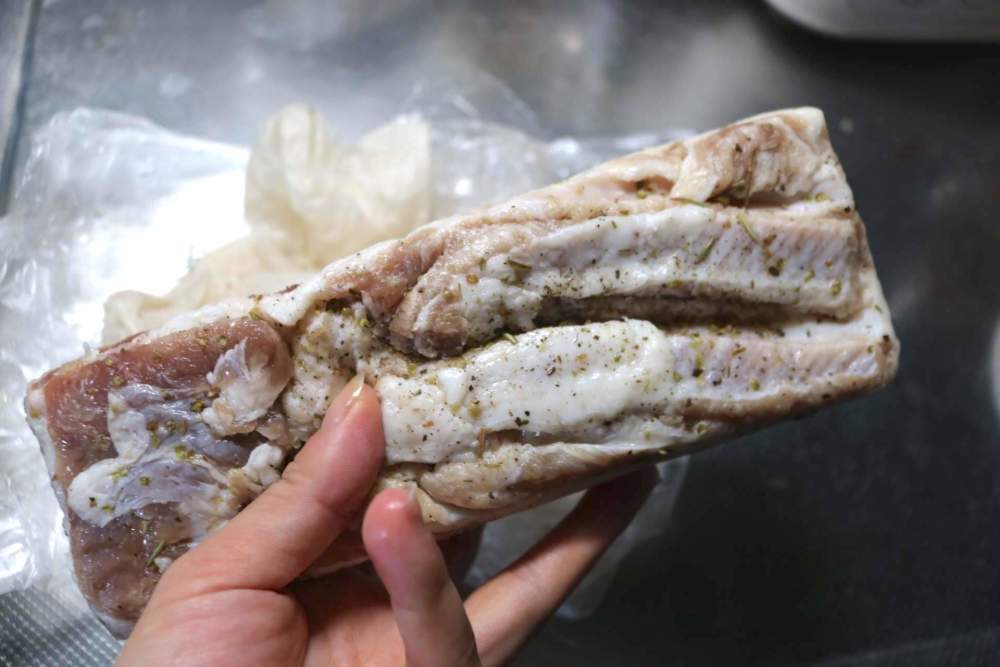 筆者は大のオレガノ信者。手を抜いてもオレガノは抜かないをモットーに日々料理をしています。そんなオレガノを主体にローズマリーやブラックペッパーをゴリゴリすり込み、これにて仕込み完成です!