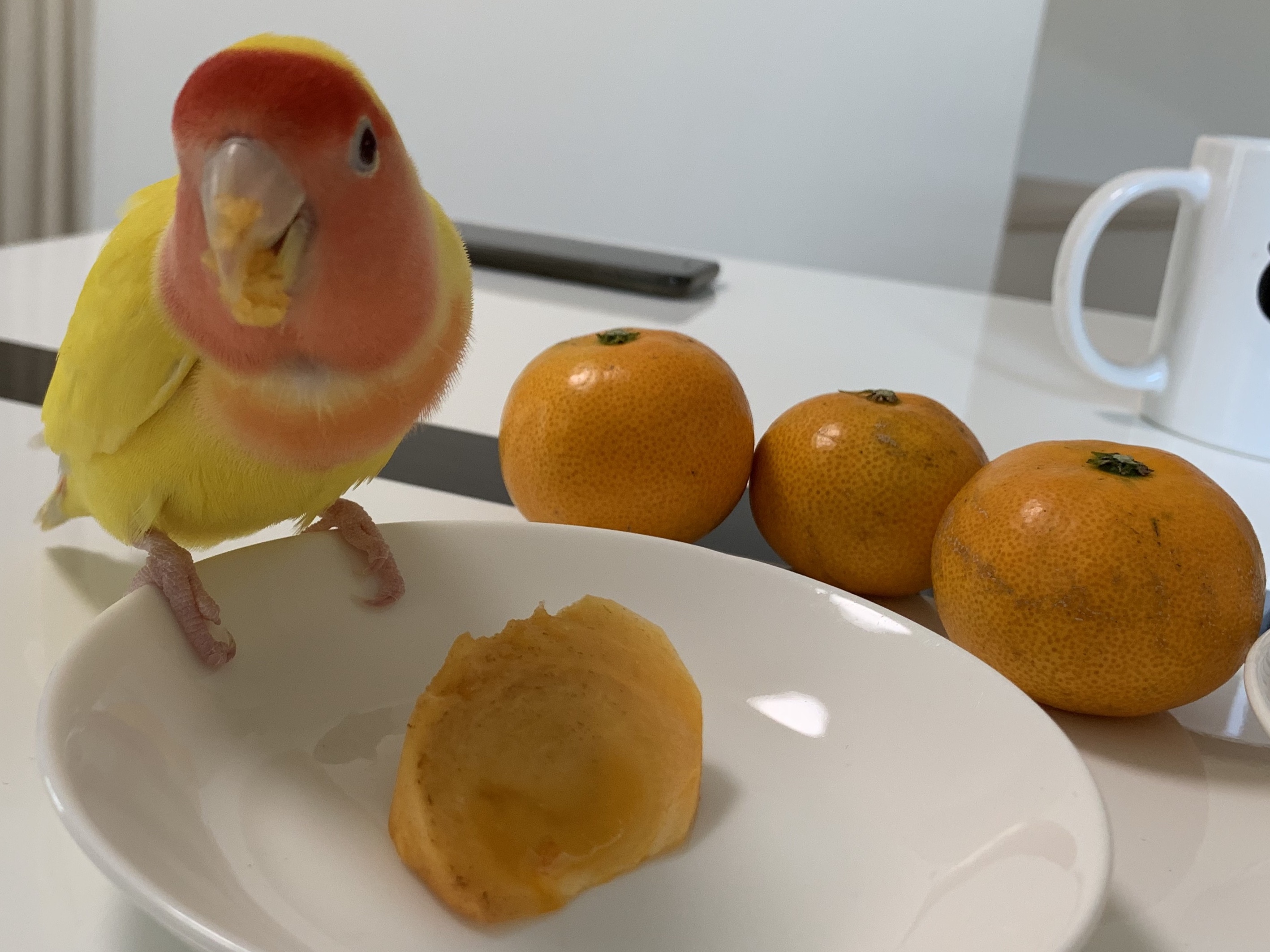 ぷうきちさんから平野吉貢さんへのごちそうさま。堅い柿が大好きなインコさんにご納得いただけたようですね。くちばしにたくさんお弁当をつけて、とってもうれしそうな表情がたまりません。ありがとうございました♡