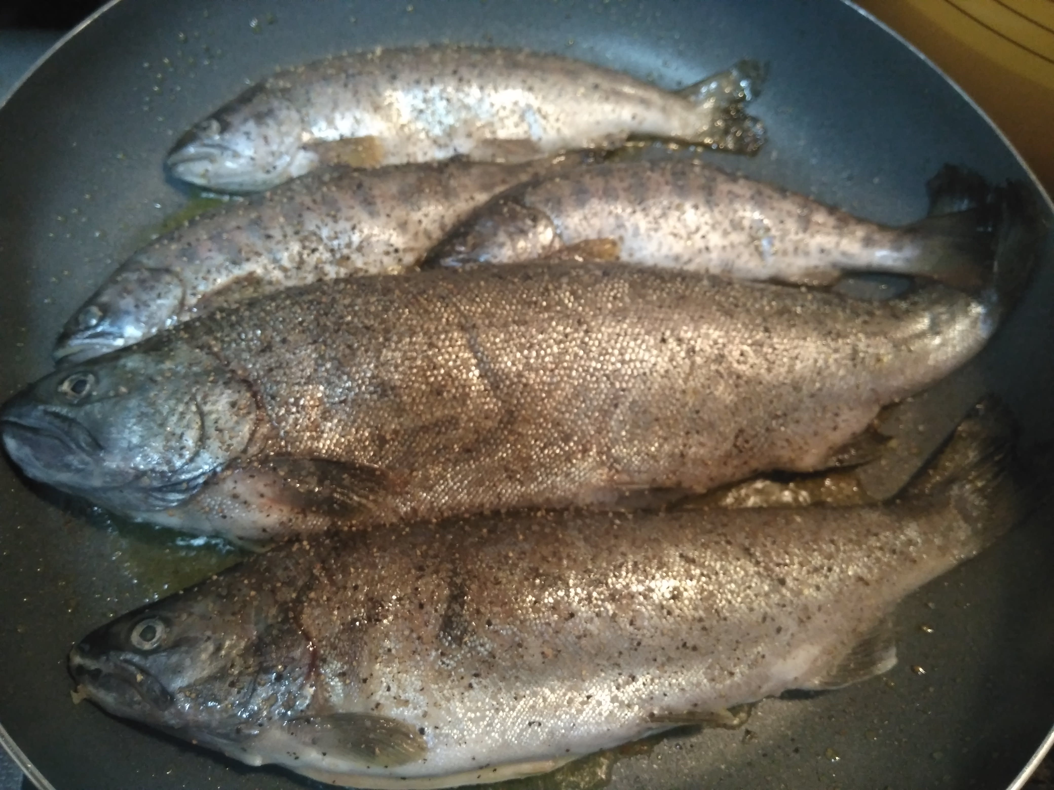 写真は32cmのフライパンで焼いている様子。真ん中の一番大きいのがKINGジャイアン、下がジャイアンofジャイアン、上の三匹はジャイアン's。(勝手に名づけ)
