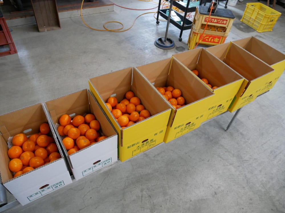 味見をしながらの収穫作業が終わり畑を後にして選果場に入ると、すでに箱詰めされたみかんが並んでいました。