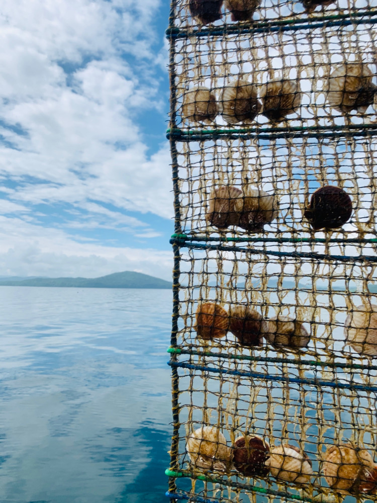2年目のほたて。1枚1枚、入ってるホタテの数と元気かどうかチェックします。